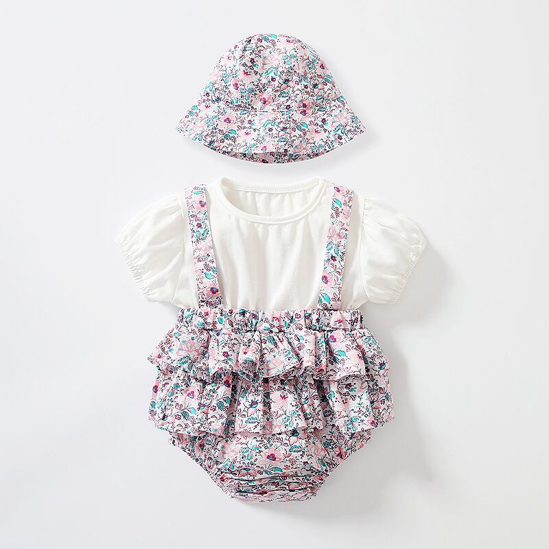 ダブルフリルの重ね着風ロンパース(帽子付き)