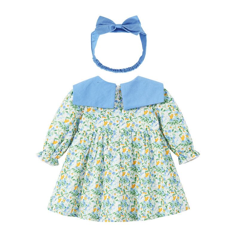 ブルーリボンの襟付き花柄ワンピース(ヘアバンド付き)