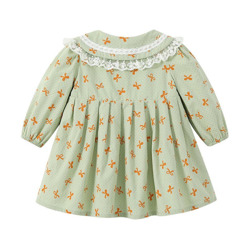 リボンプリントのタック入り長袖ワンピース