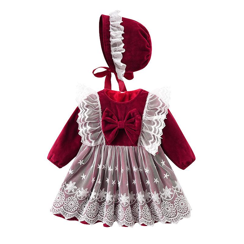 レースとリボンの長袖ベロアワンピース(帽子付き)